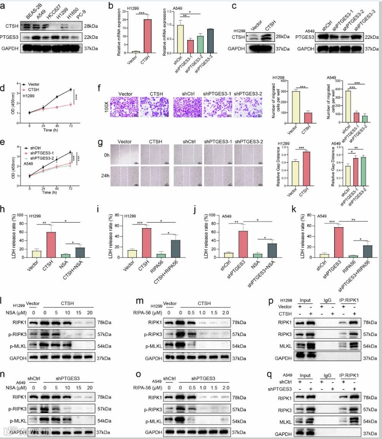 Fig. 5. Impacts of CTSH and PTGES3 on NSCLC cell proliferation, migration, and necroptosis.
