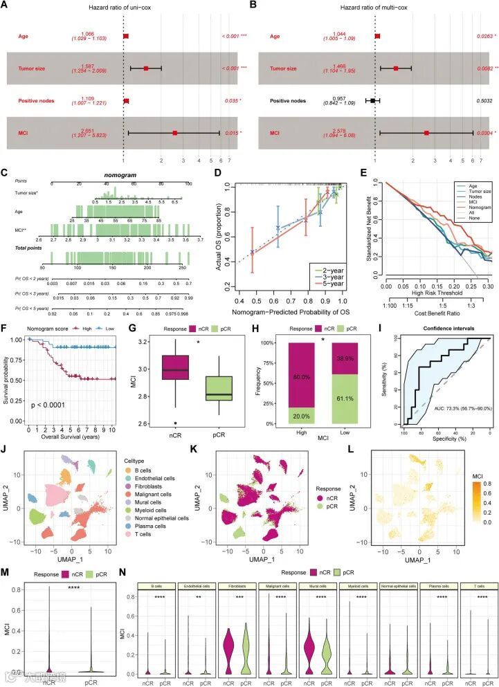 上述发现在我们包含7例确诊TNBC并接受新辅助ICB治疗及化疗患者的单细胞测序队列中得以验证(图8J)。值得注意的是,其中4例达到pCR状态,其余为nCR状态,UMAP图谱清晰展示了这一分布(图8K)。各主要细胞类型中MCI的分布情况如图8L所示,单细胞数据进一步揭示免疫治疗nCR组患者的累积MCI值显著高于pCR组,与前述结论高度一致(图8M)。具体而言,通过对比各主要细胞类型中不同治疗反应组别的MCI值,发现除正常上皮细胞外,nCR组在大多数细胞类型(包括恶性细胞)中均呈现显著升高的MCI值(图8N)。这些发现共同表明,MCI可作为预测TNBC患者免疫治疗不良反应的有效指标。