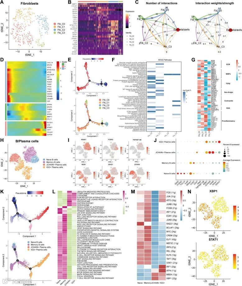 随后,我们鉴定出两个B细胞亚群(初始B细胞与记忆B细胞)及两个浆细胞亚群(JCHAIN+浆细胞与IGG+浆细胞)(图4H),各亚群的标志物表达特征如图4I、J所示。Monocle分析揭示了从B细胞向浆细胞分化的连续过程(图4K)。通路富集分析表明:初始B细胞与记忆B细胞主要富集于自然杀伤(NK)细胞介导的细胞毒性、T细胞受体信号通路等免疫调控通路;而JCHAIN+与IGG+浆细胞则显著增强泛素介导的蛋白水解、补体与凝血级联等通路活性(图4L)。