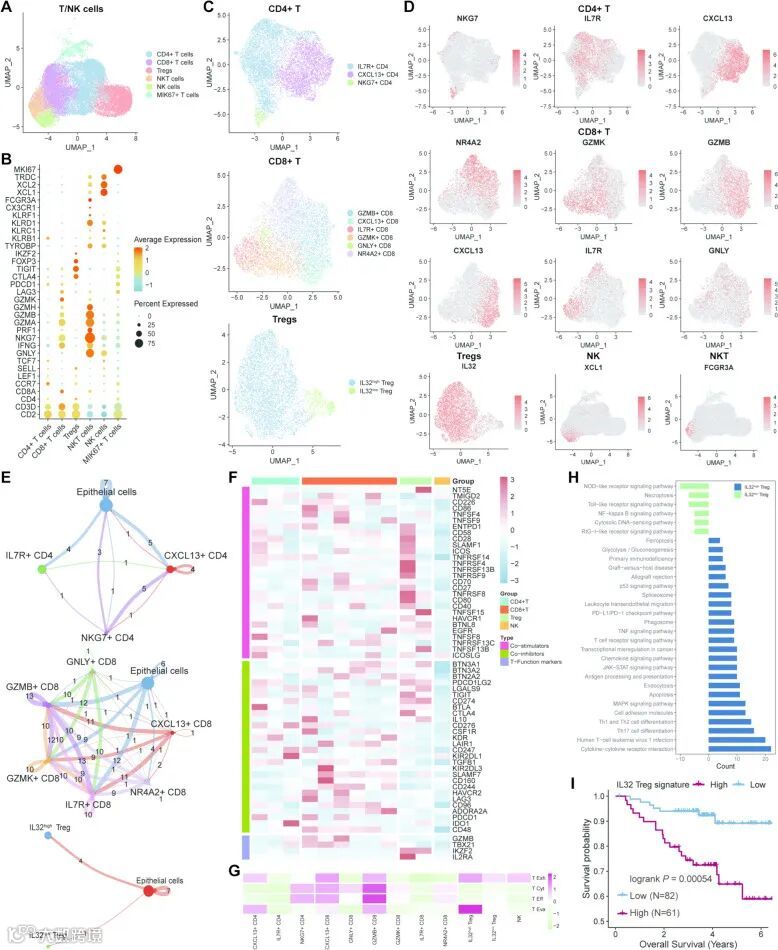 T细胞与NK细胞是肿瘤微环境(TME)中的重要组成部分。我们通过t-SNE算法对T/NK细胞进行鉴定与重分类,识别出CD4+ T细胞、CD8+ T细胞、调节性T细胞(Tregs)、MKI67+ T细胞、NK细胞及NKT细胞等主要群体(图5A),其标志物表达如图5B所示。进一步分析显示,CD4+ T细胞包含三个亚型(IL7R+、CXCL13+和NKG7+ CD4+ T细胞),CD8+ T细胞包含六个亚型(GZMB+、CXCL13+、IL7R+、GZMK+、GNLY+和NR4A2+ CD8+ T细胞),Tregs则分为IL32高表达(IL32high)与低表达(IL32low)两个亚型(图5C、D)。