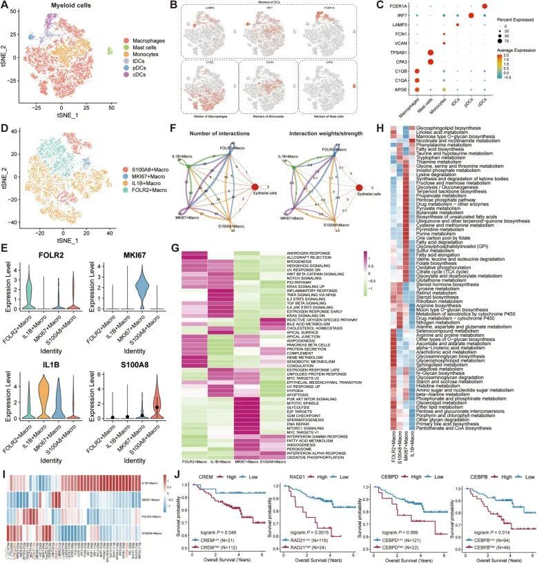 基于t-SNE算法,髓系细胞被重新划分为六个亚群:巨噬细胞、肥大细胞、单核细胞、耐受性树突状细胞(tDCs)、浆样树突状细胞(pDCs)和经典树突状细胞(cDCs)(图3A),各亚群的标志物如图3B、C所示。我们进一步聚焦巨噬细胞,鉴定出四个亚群:S100A8+巨噬细胞、IL1B+巨噬细胞、FOLR2+巨噬细胞和MKI67+巨噬细胞(图3D)。通过小提琴图展示各亚群标志物的表达水平,验证了分群的准确性(图3E)。CellChat分析显示巨噬细胞各亚群间存在广泛通讯(图3F)。