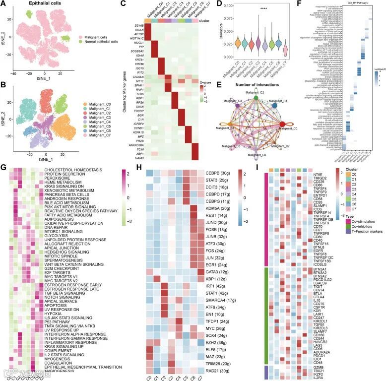 为明确TNBC上皮细胞的异质性,研究采用"inferCNV"算法区分正常上皮细胞与恶性上皮细胞,并对恶性细胞进行重聚类分析,鉴定出八个亚群(Malignant_C0–C7)(图6A、B)。各亚群的标志物表达特征如图6C所示。通过对比恶性细胞亚群的拷贝数变异(CNV)评分,发现Malignant_C3亚群的CNV评分显著高于其他亚群(图6D)。CellChat分析显示,Malignant_C5亚群在恶性细胞亚群间具有最广泛的相互作用(图6E)。基于GO和hallmark数据库的功能富集分析表明:Malignant_C5亚群参与T细胞活化、细胞间黏附、细胞外基质组织及上皮间质转化(EMT)的调控;Malignant_C2亚群主要富集于干扰素α/γ反应通路;Malignant_C1亚群则在脂肪酸代谢、糖酵解、氧化磷酸化和活性氧通路等代谢调控中发挥潜在作用(图6F、G)。进一步分析恶性细胞亚群的转录因子活性及免疫相关基因(共刺激、共抑制及功能标志物)表达发现:Malignant_C5亚群中CCAAT增强子结合蛋白家族转录因子及多种免疫调控基因表达上调;而与干扰素反应相关的关键转录因子(如STAT1、IRF1)在Malignant_C2亚群中显著激活(图6H、I)。综上研究表明,TNBC恶性上皮细胞各亚群通过不同的功能通路特征,可能对肿瘤微环境的演进产生重要影响。