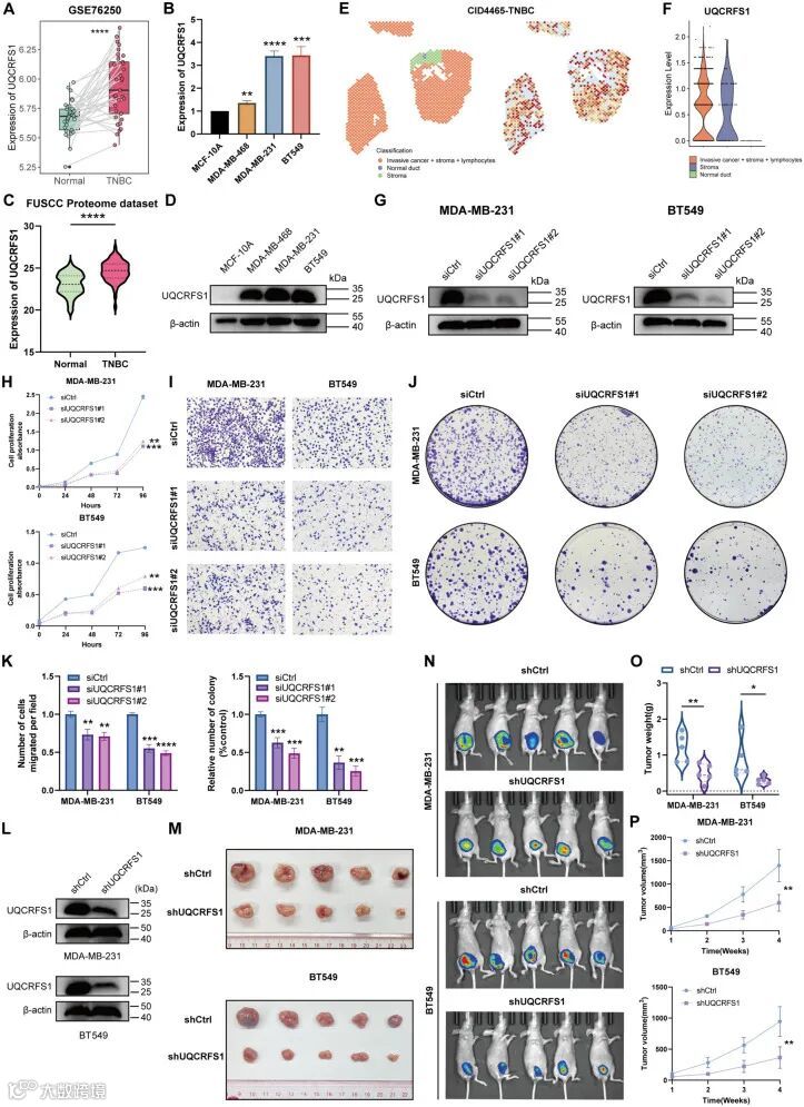 在MCI包含的恶性相关基因中,铁硫黎簇蛋白(UQCRFS1)在TNBC中的具体机制尚不明确。为此,我们深入探讨了UQCRFS1在TNBC中的表达特征及临床意义。首先,通过分析GSE76250数据集中配对癌组织与癌旁样本发现,UQCRFS1在TNBC组织中表达明显增强(图9A)。随后采用qRT-PCR技术验证细胞系中的mRNA表达水平,发现相较于乳腺上皮细胞MCF-10A,TNBC细胞系中UQCRFS1的mRNA表达显著升高(图9B),这与前期生物信息学分析结果一致。基于FUSCC蛋白质组数据分析显示,TNBC患者组织中UQCRFS1的蛋白表达水平同样呈现上调趋势(图9C)。Western blot实验进一步在蛋白层面证实,TNBC细胞系中UQCRFS1表达显著增强(图9D)。通过分析包含TNBC患者的空间转录组(ST)数据集,发现UQCRFS1主要富集于肿瘤区域,而在正常导管区域表达较弱(图9E、F)。