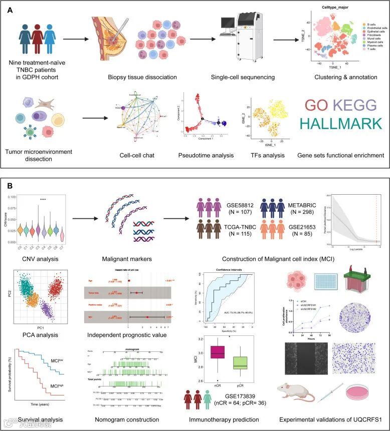 本研究通过多组学整合分析,系统描绘了三阴性乳腺癌高度异质的肿瘤免疫微环境图谱,鉴定出一个关键的免疫抑制性Treg亚群,构建了一个基于恶性上皮细胞特征的预后模型,并首次深入验证了线粒体基因UQCRFS1在TNBC中的促癌功能及其与免疫治疗抵抗的关联。