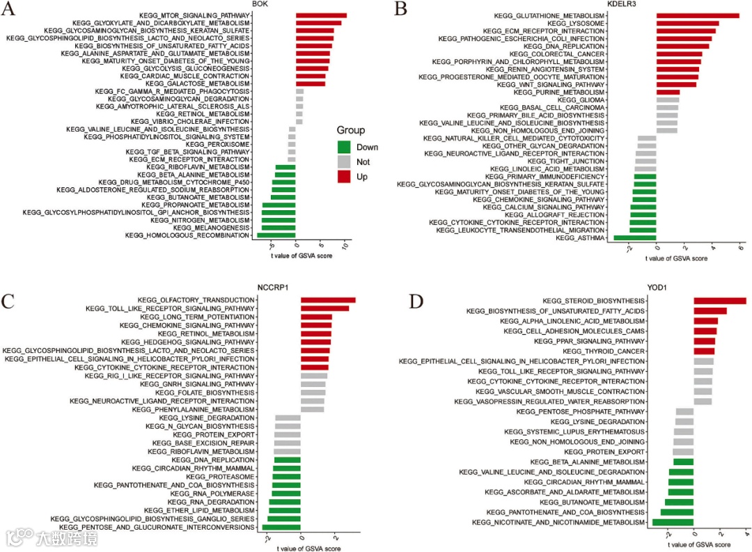 基因集变异分析(GSVA)结果显示,四个核心基因(BOK、KDELR3、NCCRP1 和YOD1)与多个关键信号通路存在显著相关性(图 6A-D)。BOK 高表达与MTOR 信号通路、糖酵解和二羧酸代谢的激活显著相关,NCCRP1 高表达与嗅觉转导和Toll 样受体信号通路的激活显著相关,但抑制DNA 复制和蛋白酶体通路。类似地,YOD1 高表达上调类固醇生物合成和不饱和脂肪酸生物合成通路,同时下调烟酰胺和烟酸代谢通路。