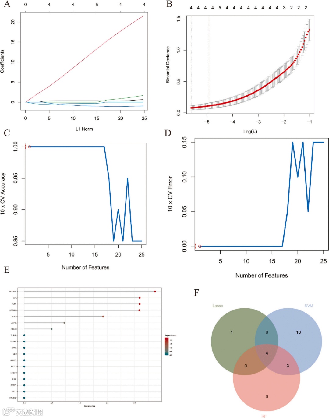 通过韦恩图对WGCNA核心模块基因、DEGs 和ERRGs 进行重叠分析,鉴定出26个重叠基因。采用LASSO、SVM 和随机森林3 种机器学习算法进一步筛选DFU 特征性ERRGs 生物标志物:LASSO 算法经最优对数λ 值确定后,基于L1 正则化筛选出5 个特征变量(图 4A、4B);SVM 算法结合10 折交叉验证鉴定出17 个特征基因(图 4C、4D);随机森林算法对 26 个关键DE-ERRGs 进行变量重要性排序(图 4E),最终筛选出 7 个重要变量。整合3 种模型结果(图4F),通过重叠分析确定 4 个基因:NCCRP1、KDELR3、BOK 和YOD1,它们可能作为DFU 的潜在特征生物标志物。