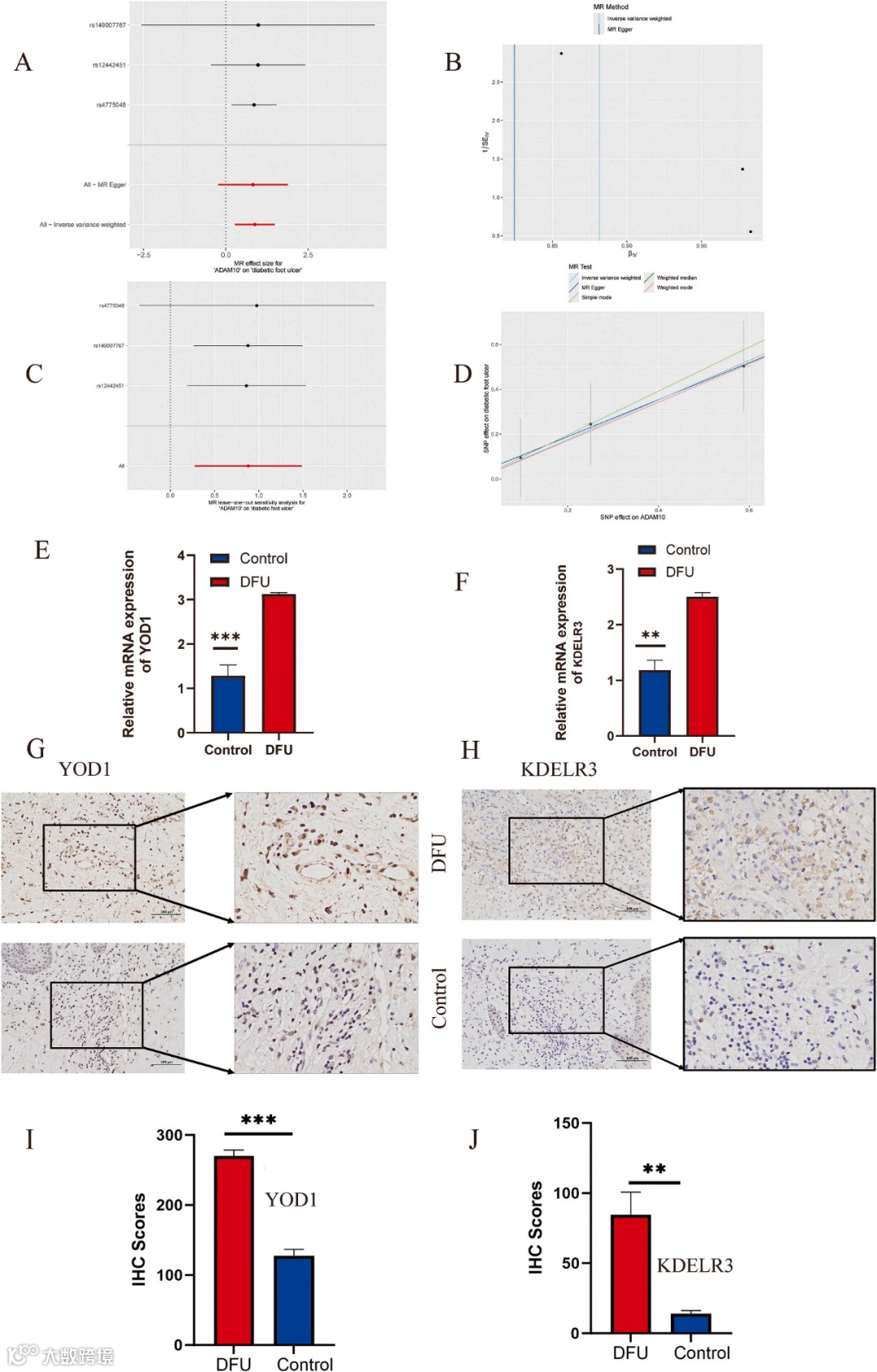 该研究聚焦糖尿病足溃疡(DFU)的内质网应激(ERS)机制,通过整合多组学分析与实验验证,揭示关键突破。采用WGCNA、LASSO、SVM和随机森林等多方法筛选,鉴定出NCCRP1、KDELR3、BOK、YOD1 4个ERS相关特征蛋白,其中KDELR3和YOD1在训练集和验证集中均表现出强诊断性能(AUC值分别达0.819/0.875和0.889/0.856)。孟德尔随机化证实BOK与DFU存在因果关联,单细胞测序揭示KDELR3和YOD1在软骨细胞、角质形成细胞等中的特异性高表达及与炎症的关联。分子对接显示甲硝唑与4个蛋白结合良好,体外实验验证其可下调相关基因表达。该研究为DFU的诊断标志物开发和靶向ERS的治疗策略提供了多维度证据。