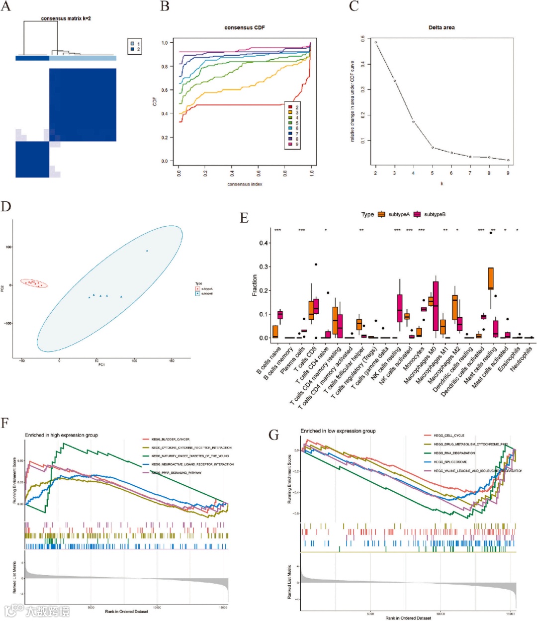 为阐明 DFU 中ERS 的分子模式,基于ERS 相关基因的表达谱进行无监督共识聚类分析。通过评估共识矩阵(图 8A)、累积分布函数(CDF)曲线(图 8B)和 CDF delta 面积曲线(图 8C),确定最佳聚类数为 k=2。主成分分析(PCA)进一步显示两种亚型存在明显区分(图 8D)。免疫细胞浸润分析显示两种亚型的免疫细胞组成存在显著差异:与亚型 A 相比,亚型B 中naive B 细胞、CD8 T 细胞和单核细胞比例显著升高(P<0.01),而滤泡辅助性T 细胞、M1 巨噬细胞和静息肥大细胞比例显著降低(P<0.001)(图 8E),提示 DFU 存在两种具有不同免疫特征的分子亚型。基因集富集分析(GSEA)进一步揭示两种亚型的生物学差异:亚型 A 中细胞因子 - 细胞因子受体相互作用、1 型糖尿病、神经活性配体 - 受体相互作用和PPAR 信号通路显著富集(图 8F);而亚型 B 则富集于细胞周期、细胞色素P450 介导的药物代谢、RNA 降解、剪接体及缬氨酸 - 亮氨酸 - 异亮氨酸降解通路(图 8G)。这些结果揭示了两种亚型的显著功能差异,为理解 DFU 潜在的分子和生物学机制提供了见解。