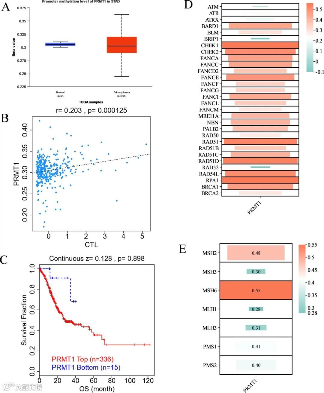 图8 PRMT1参与表观遗传调控及损伤基因修复。A PRMT1甲基化表达水平图谱,其中蓝色代表正常组,红色代表肿瘤组;B PRMT1甲基化水平与细胞毒性T淋巴细胞(CTL)标志物的关系分析图;C PRMT1高甲基化与低甲基化亚组的生存曲线;D-E PRMT1与同源重组修复(HRR)、错配修复(MMR)系统相关性热图。红色代表正相关,绿色代表负相关;方框大小表示相关性强度,方框越大,相关性越强。