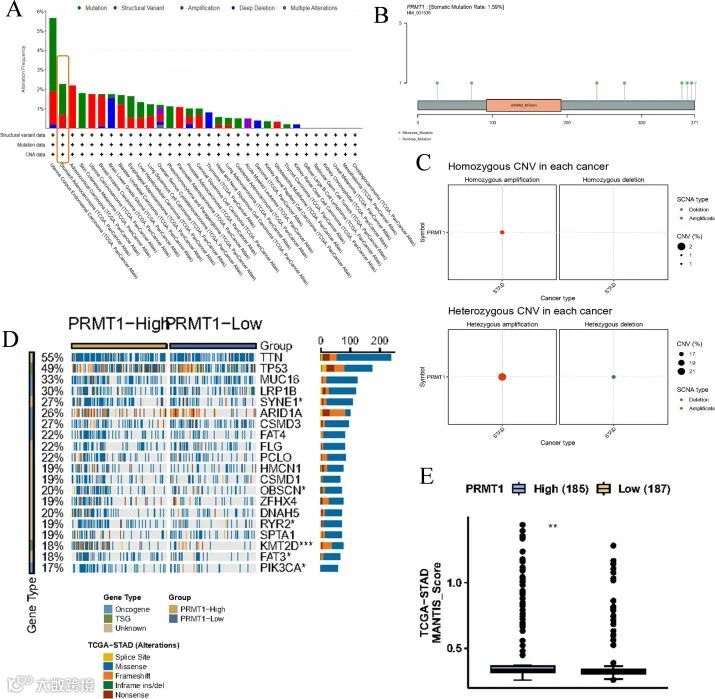 图7 PRMT1突变对胃癌的影响。A PRMT1在多种癌症中的突变类型。橙色方框内为其在胃癌中的突变类型;B PRMT1的单核苷酸变异(SNV)突变位点及类型。圆圈颜色代表突变类型,线条长度代表突变频率;C PRMT1的杂合及纯合拷贝数变异(CNV)突变气泡图。气泡越大,代表突变比例越高;D驱动基因与PRMT1的突变关联分析图;E PRMT1的微卫星不稳定(MSI)表达水平箱线图。
