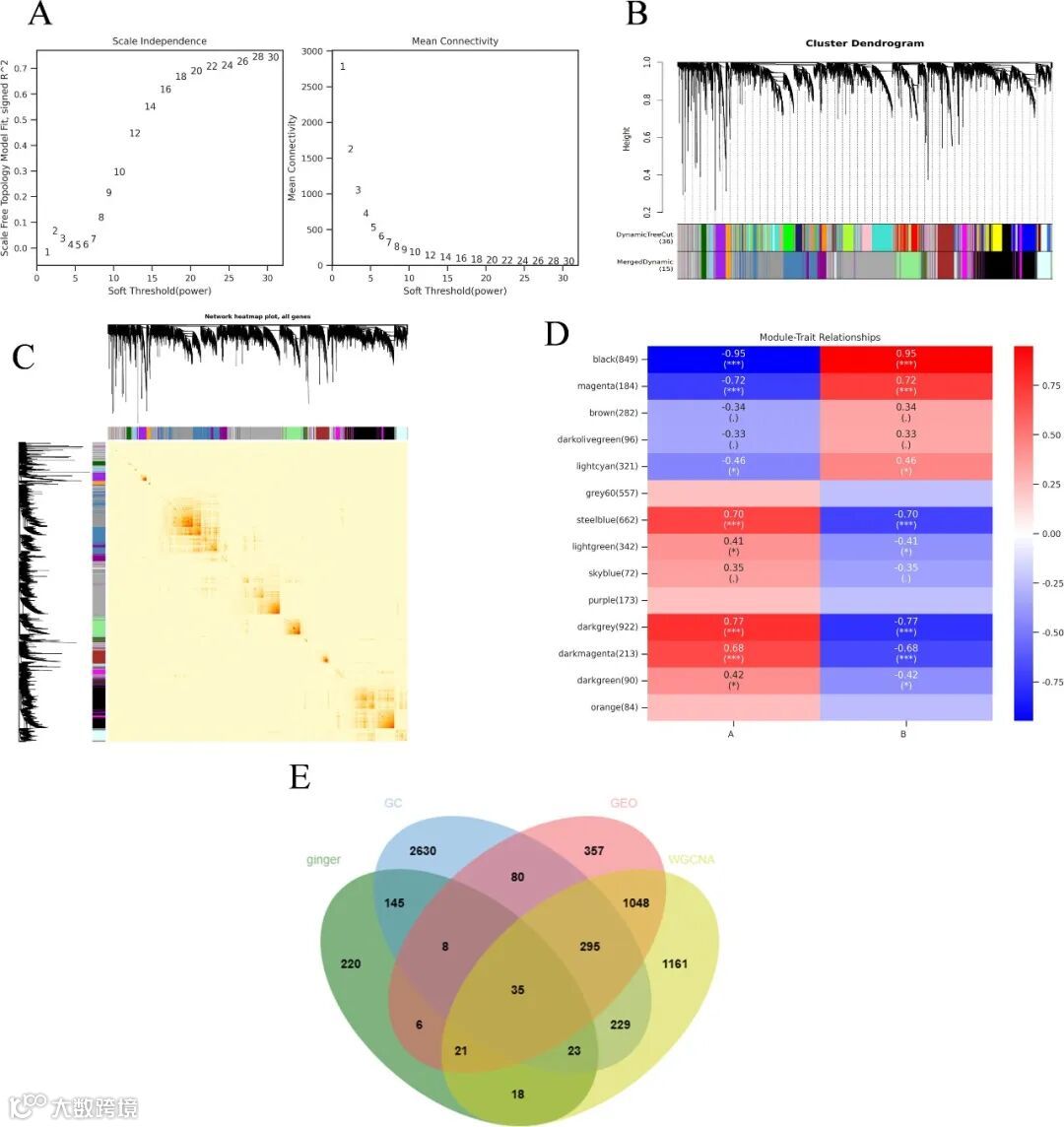 在WGCNA分析结果中,图3A左侧展示了不同幂值对应的相关系数,右侧则呈现了基于相同幂值构建的网络的平均连接度。结果显示,当幂值设为28时,网络的相关系数和平均连接度均达到最高水平。因此,选择28作为后续模块构建的幂值。利用所选幂值构建加权共表达网络模型,将5422个基因划分为15个不同模块,结果以基因聚类树状图呈现(图3B)。图上方为基因聚类树,下方为基因在各模块中的分布情况。相同颜色表示属于同一模块,“Dynamic Tree Cut”标注的颜色代表通过dynamicTreeCut方法识别的模块。由于部分模块之间存在相关性,相关模块被合并为单个模块,即“Dynamic”下方标注的“Merged module”(合并模块)。同时,还获得了所有基因聚类的热图(图3C)。采用皮尔逊相关算法计算模块特征基因与表型的相关系数及p值,结果显示黑色、品红色、钢蓝色、深灰色和深品红色这5个模块的p值最显著,合并去重后共得到2830个基因(图3D)。图中纵轴代表各个模块,横轴代表各个表型,结果呈现了模块与表型之间的相关性,红色表示正相关,绿色表示负相关。通过取生姜靶点基因、胃癌靶点基因、GEO差异基因及WGCNA所得靶点基因这四者的交集,获得了35个交叉基因(图3E)。