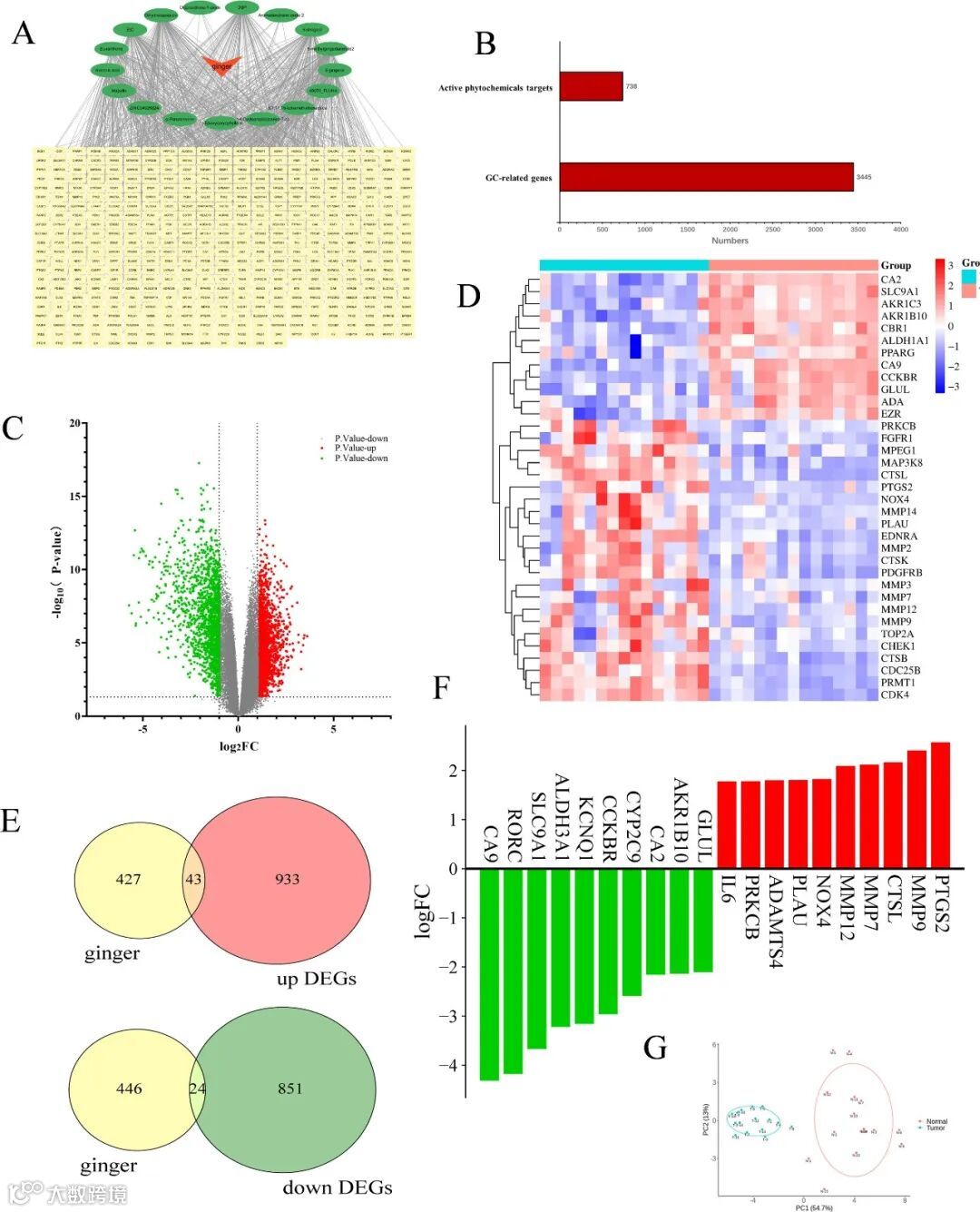 从GeneCard、OMIM和DisGeNET数据库中获取了3445个胃癌疾病靶点,并绘制了药物-疾病靶点柱状图(图2B)。为进行后续分析,我们从GEO数据库中选取了GSE118916数据集。通过分析,我们在正常组织与胃癌组织之间共鉴定出1850个差异基因,其中包括975个上调基因和875个下调基因。为直观呈现这些结果,我们绘制了差异基因的火山图(图2C),图中红色代表上调基因,绿色代表下调基因,灰色代表无显著差异表达的基因。进一步分析中,我们通过聚类热图展示了上调和下调的差异基因(图2D)。在该热图中,样本中表达水平升高的基因以红色显示(显著上调),表达水平降低的基因以绿色显示(下调)。此外,我们通过维恩图分析对比了上调基因、下调基因与生姜的预测靶点,鉴定出43个上调基因和24个下调基因(图2E)。最后,我们以柱状图形式可视化了这些上调和下调基因(图2F),清晰呈现了本研究中观察到的基因表达变化。通过主成分分析(PCA)发现,所选样本的成分聚集性较好、交叉较少,表明这些靶点的样本代表性较强(图2G)。