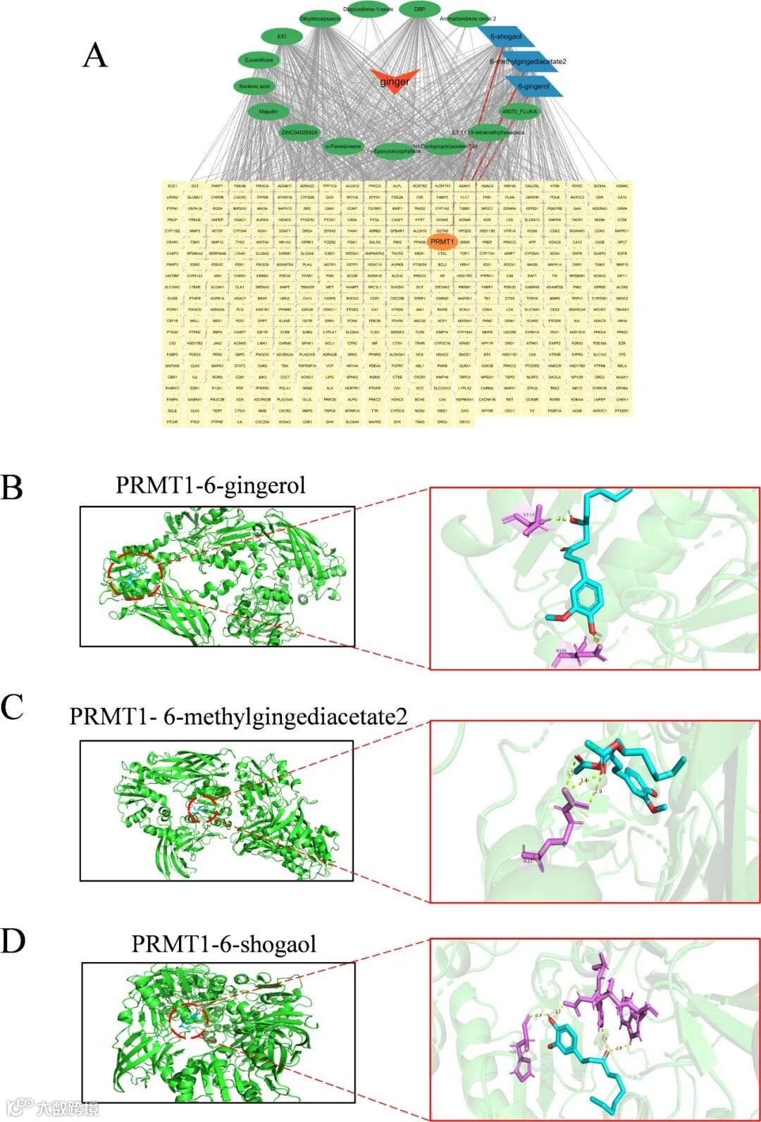 图10 PRMT1与生姜活性成分的分子对接。A PPI网络中PRMT1对应的生姜活性成分。橙色圆圈代表PRMT1,蓝色菱形代表与PRMT1对应的生姜活性成分,二者通过红线连接;B、C、D分别代表PRMT1与6-姜酚、6-甲基姜二乙酸酯2、6-姜烯酚的分子对接可视化结果。