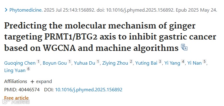 今天小编要和大家分享的这篇文章是2025年7月发表在《Phytomedicine》(IF:5.340)期刊上的文章《Predicting the molecular mechanism of ginger targeting PRMT1/BTG2 axis to inhibit gastric cancer based on WGCNA and machine algorithms》。以下是这篇文章的主要亮点,一起跟着小编来看一下叭~