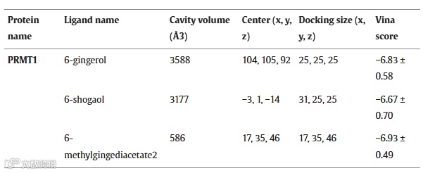 为有效识别生姜治疗胃癌所需的关键活性成分及特定分子靶点,我们构建了一幅网络图,将生姜中的活性成分与PRMT1紧密关联(图10A)。我们将这些活性成分分别与PRMT1进行分子对接,可视化结果如图10B-D所示。对接后,基于结合能评估结合活性,并生成了活性成分与PRMT1结合能的三线表(表1)。结果显示,PRMT1均能与生姜的活性成分良好对接。