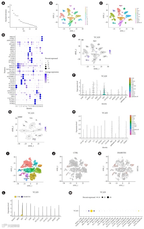 进一步的,通过单细胞测序技术,精准定位 VCAN 在肾脏组织中的表达细胞类型及病理状态下的差异,明确其与 DKD 的细胞水平关联。从数据预处理(肘部图确定 PCA 主成分数量)到细胞聚类注释(得到 13 种肾脏主要细胞类型),再到 VCAN 表达分布分析,最终证实:在 DKD 患者中,VCAN 显著富集于肾小球壁层上皮细胞(PEC)和近端曲小管细胞(PCT)—— 这两种细胞分别是肾小球、肾小管病变的核心参与细胞,且表达水平显著高于对照组;同时,K.I.T. 公共数据库的验证结果与本研究一致,进一步确认 VCAN 的细胞特异性表达特征,为后续探究 VCAN 的病理功能提供了明确的细胞载体