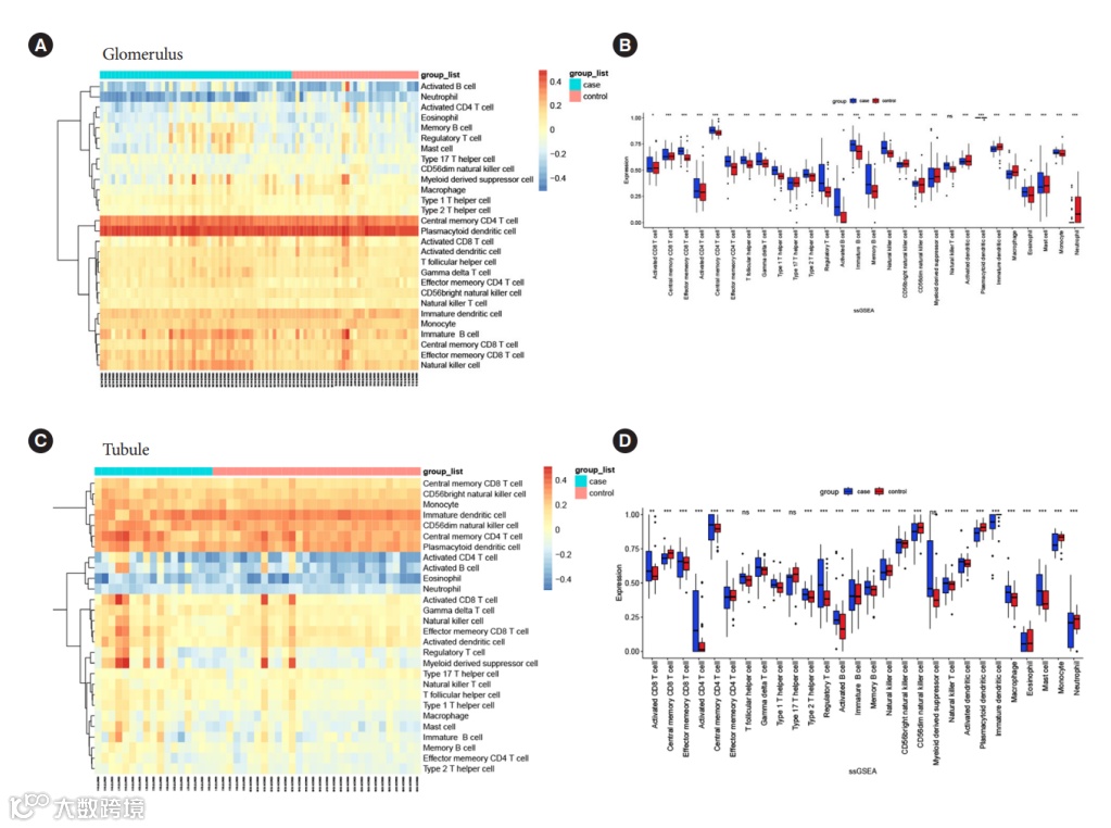 接下来,通过免疫浸润分析显示,肾小球数据集中DEGs主要富集于中枢记忆CD4 T细胞和浆细胞样树突状细胞。与对照组相比,DKD患者在活化的CD4 T细胞、调节性T细胞、记忆B细胞和肥大细胞中表现出显著活化。在小管数据集中,DEGs主要集中于未成熟树突状细胞、CD56dim自然杀伤细胞、中央记忆CD4 T细胞和浆细胞样树突状细胞。与对照组相比,DKD患者中自然杀伤细胞、效应记忆CD8 T细胞、活化树突状细胞和肥大细胞均显示显著活化。因此,可以得知肥大细胞参与了肾小球和肾小管的共同免疫浸润模式。