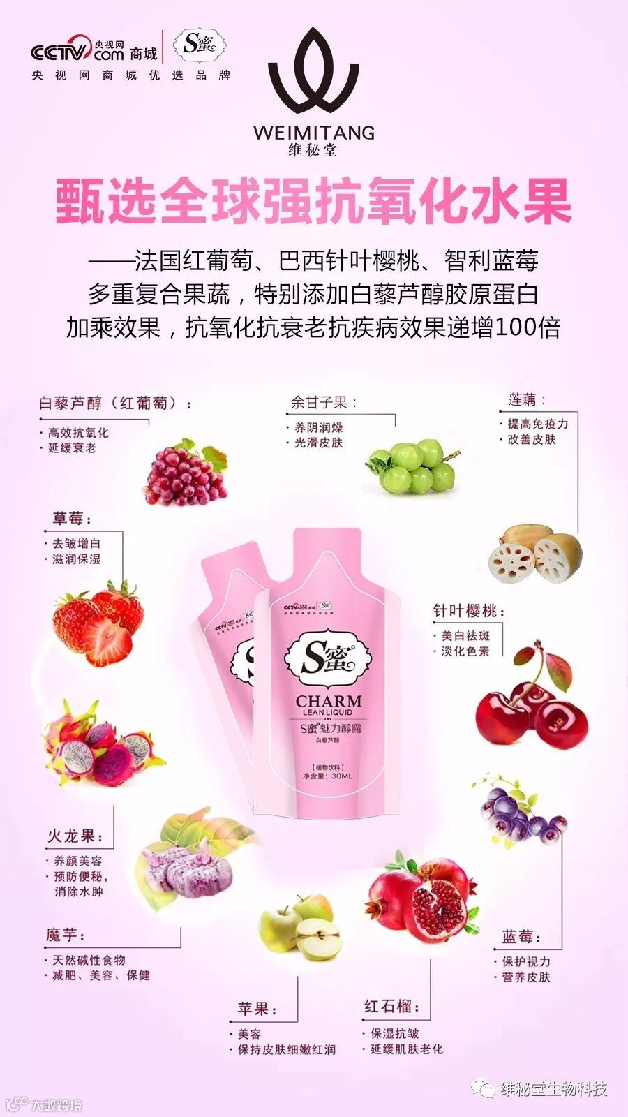 S蜜白藜芦醇魅力醇露它是一款综合多种天然抗氧化水果营养的健康植物饮品。从红葡萄中萃取高抗氧化剂-白藜芦醇,搭配多种高营养天然水果配方,为人体形成蜂窝结构网的紧密健康防护盾!结合最易人体吸收的悬浮凝胶技术,让细胞达到近100%的吸收率,使身体持续保持健康的状态!美味口感、多重功效,能为您带来惊人的抗衰老、美容养颜功效和高营养价值,给身体也提供了全方位的保养和防护!