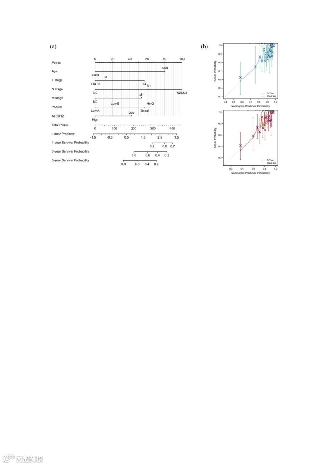 由于多变量分析显示ALOX 12是一个预测因素,进一步使用列线图将ALOX 12与患者的基本特征结合联合收割机进行生存预测(图3a)。采用两种方法对模型进行了验证,采用Bootstrap自抽样法对模型进行了检验,其一致性指数(C-index)为0.730(0.703-0.757)。之后还进行了图形校准方法分析,结果显示3年OS和5年OS的预测生存率与实际生存率之间具有高度一致性(图3b)。
