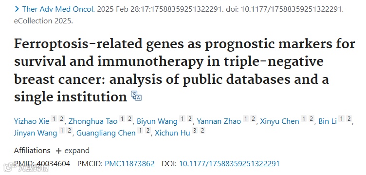 2025年2月发表在《Therapeutic Advances in Medical Oncology》(IF:8.1)的这项突破性研究,首次构建了铁死亡相关基因(FRGs)指导下的三阴性乳腺癌(TNBC)精准治疗新范式。该研究不仅揭示了铁死亡调控TNBC免疫微环境的新机制,更创新性提出"铁死亡调节剂联合免疫治疗"的精准分型策略,为这一难治性乳腺癌亚型的个体化治疗提供了分子标志物和治疗靶点。这篇文章是如何在冲上8分+的呢?又有哪些亮点呢?一起来看看吧!