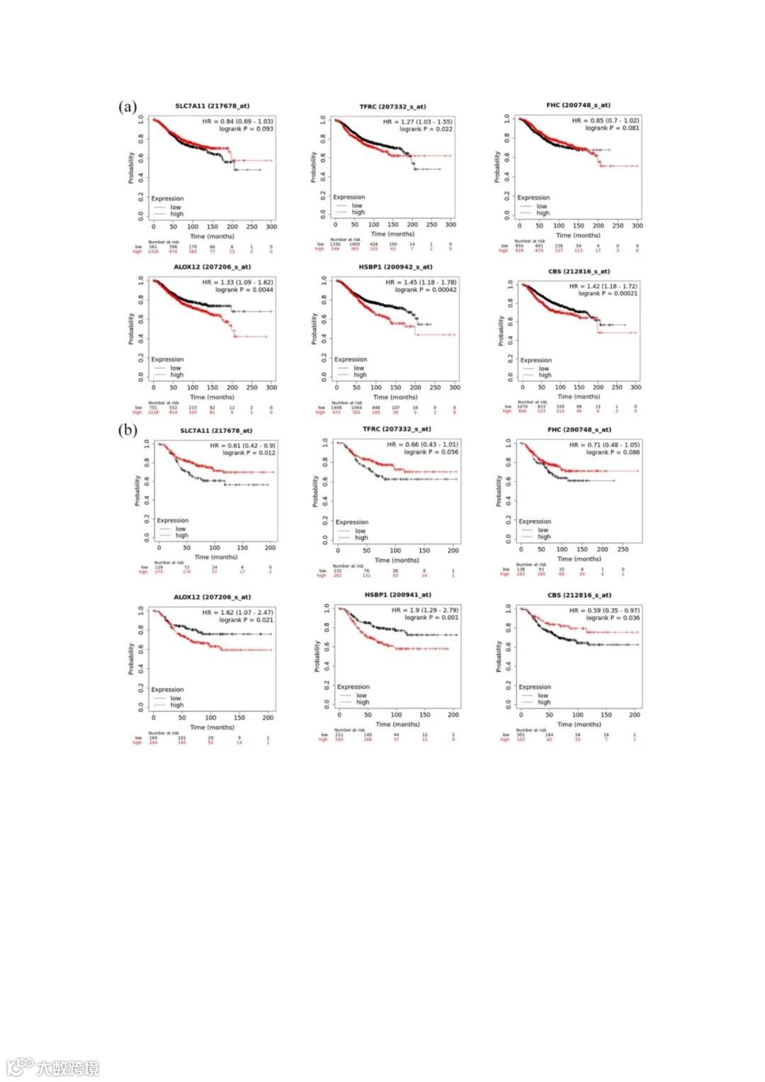 为了进一步评估铁蛋白减少相关基因在乳腺癌患者中的预后价值,利用TCGA数据库中的mRNA表达数据和患者的生存信息进行了考克斯回归分析,并在Kaplan-Meier方法中显示,结果发现6个典型的铁蛋白减少相关基因与乳腺癌预后相关:SLC 7A 11、TFRC、FTH 1、ALOX 12、HSBP 1和CBS(图2a)。
