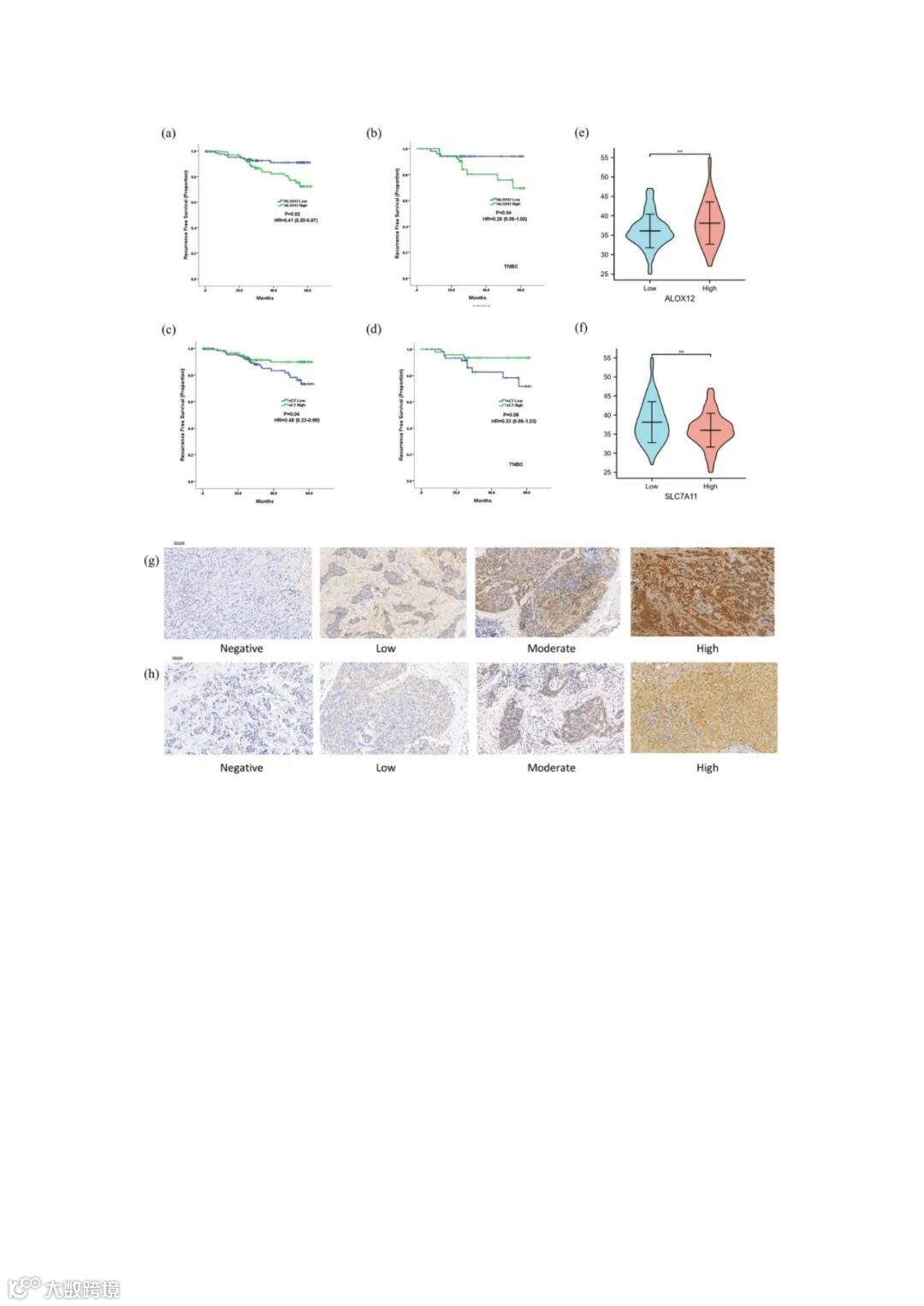 为了进一步证明铁蛋白沉积相关基因的预后价值及其与脂肪细胞的关系,对本中心的乳腺癌患者进行了免疫组织化学(IHC)检测。共258例乳腺癌患者在复旦大学上海肿瘤中心(FUSCC)登记并分析了肿瘤组织阵列和完整的病历。IHC染色评分为0,1,2,根据SLC7A11和ALOX 12表达划分的两个治疗组之间的基线患者特征。ALOX12高表达或SLC7A11低表达的患者N分期较低,血管浸润较轻。生存分析显示,与所有患者的ALOX12高患者(图4a)和TNBC亚型(图4b)相比,ALOX12低患者的RFS显著改善。