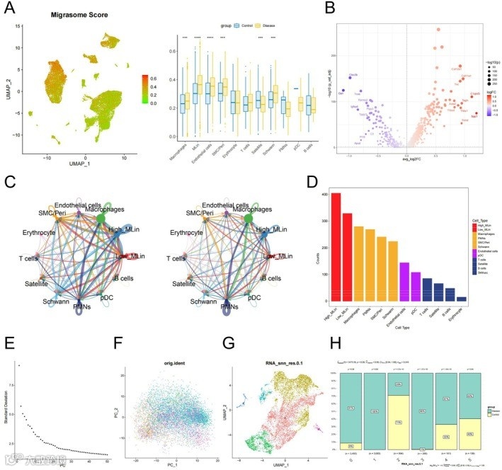 接下来,量化了迁移组评分,结果显示,MLin亚组不仅在所有细胞类型中表现出最高的迁移组评分,而且在对照组和疾病组之间显示出最大的迁移组评分差异,在疾病状况中显着上调(图2A)。这些发现表明 MLin 与疾病特异性迁移体活性之间存在潜在关联。因此,选择MLin 进行进一步分析。使用 |avg_log2FC|> 0 和调整后的p 值 (p_val_adj)< 0.05,在这种细胞类型中总共鉴定出 1384 个差异表达基因 (DEG),如火山图所示(图2B)。这些DEGs被用作后续分析的基因集。然后,根据迁移组中位数评分将MLin 分为High_MLin 组和Low_MLin组。使用CellChat 软件包分析细胞通信。在多个细胞群中观察到广泛的配体-受体对网络,其特征是高连通性和各种相互作用强度,表明复杂的细胞间相互作用(图2C)。值得注意的是,High_MLin与其他细胞类型表现出特别活跃的信号行为(图2D)。MLin 的进一步子集通过PCA、Harmony、ElbowPlot 和 FindClusters 识别了6 种亚型(图2E-G)。C1亚型是仅在疾病样本中发现的特定亚组,被确定为疾病特异性亚组(图2H)。简而言之,这些发现表明,通过迁移体评分识别的 MLin 亚群可能在HO 的进展中发挥关键作用。