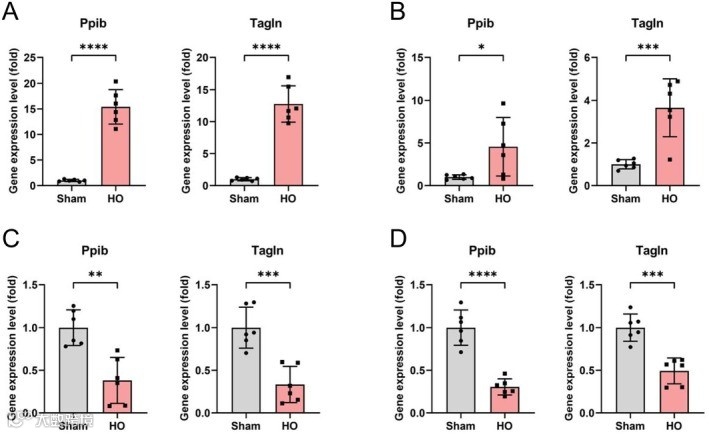 为了验证关键基因的表达水平,采用qRT-PCR技术。结果表明,在受伤后1周(图9A)和4周(图9B)时,HO模型中Ppib和Tagln基因表达显着上调,随后在7周(图9C)和10周(图9D)显着下调。