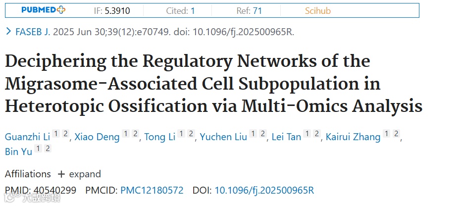 今天小编要和大家分享的这篇文章是2025年6月发表在《FASEB J》(IF:5.3)期刊上的文章《Deciphering the Regulatory Networks of the Migrasome-Associated Cell Subpopulation in Heterotopic Ossification via Multi-Omics Analysis》。这篇文章是怎么发到了5+分的呢,那这篇文章又有哪些亮点呢,一起跟着小编来看一下叭~