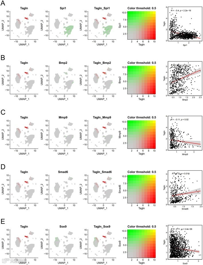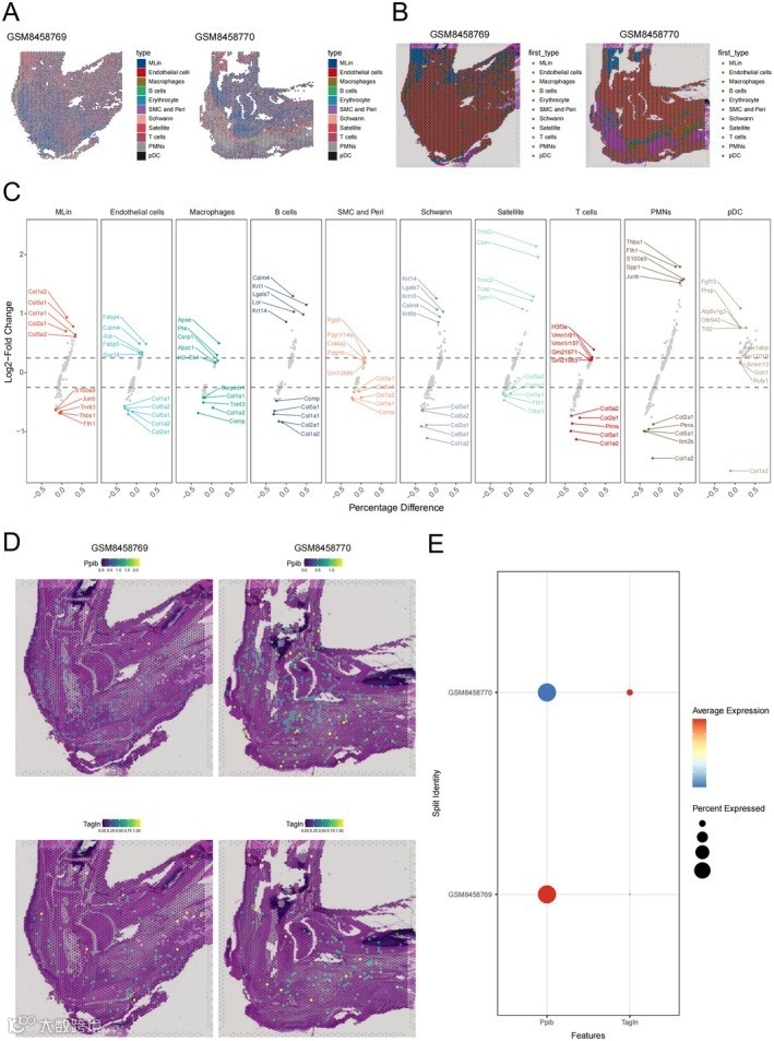 亮点三:空间转录组揭示空间分布特征:利用空间转录组去卷积分析,明确了 MLin 等关键细胞亚群在组织中的空间分布,以及 Ppib 和 Tagln 的空间表达模式,将细胞功能与组织微环境空间定位关联,深化了对 HO 局部病理微环境的理解。
