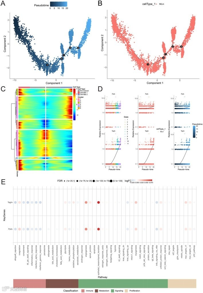 通过首先计算细胞之间的相似性并构建细胞分化轨迹来进行伪时间分析。通过可视化这一轨迹,可以跟踪细胞的发育过程,研究不同时间点的基因表达模式。伪时间是Monocle根据细胞基因表达信息计算出的概率,反映了时间顺序。使用伪时间值和细胞类型为细胞着色(图7A,B)。不同分支的基因表达差异,在整体热图中未表现出来。鉴定了分支点前后表达差异较大的基因,并在分支热图中可视化它们(图7C)。HO关键基因Ppib和Tagln的表达在细胞分化过程中总体呈上升趋势(图7D)。使用AUCell量化单细胞中的免疫和代谢通路基因评分,并生成气泡图以显示这些通路中HO关键基因的活性差异。结果显示,Ppib 和Tagln 在上皮间充质转化和血管生成等途径中具有高活性(图7E)。