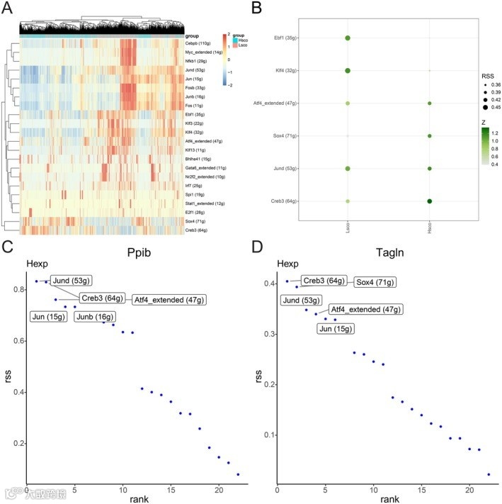 考虑到MLin在疾病组和对照组之间游走体评分差异最大,选择MLin亚组进SCENI分析,并输出该亚组内的所有调节子(Step2_regulonTargetsInfo.tsv)。MLin根据中位游走体评分分为高分组(Hsco)和低分组(Lsco)。生成热图以可视化每个细胞的调节子活性分数(图6A)。计算了每个调节子的调节子特异性评分 (RSS),以评估其在 Hsco 和 Lsco 组之间的特异性。使用气泡图可视化结果(图6B)。随后,根据2个关键基因Ppib和Tagln的表达水平,将MLin分为高表达组(Hexp)和低表达组(Lexp)。使用散点图可视化 Hexp 组中前5 个最特异性的调节子。在Ppib高表达的MLin中,Jund,Creb3,Atf4,Jun和Junb表现出最高的调节子特异性(图6C)。同样,在高 Tagln 表达的 MLin 中,Creb3、Sox4、Jund、Atf4 和 Jun 显示出最大的特异性(图6D)。