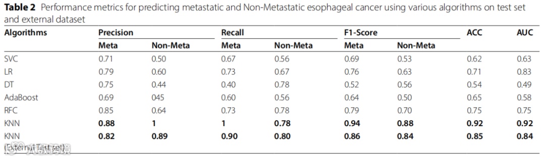 提取的特征被传递给不同的机器学习模型进行分类。KNN表现优于其他模型,包括支持向量机、逻辑回归、决策树、AdaBoost和随机森林。该模型在预测转移性肿瘤方面表现强劲,精度为0.88,召回率为1.00,F1得分为0.94。对于非转移性肿瘤,精度为1.00,召回率为0.78,F1得分为0.88。模型的整体准确率和AUC得分为92%。在24张测试图像中,15张是转移性肿瘤,9张是非转移性肿瘤。模型正确识别了所有15张转移性切片和7张非转移性切片,突显了OncoMet算法的准确性和有效性。所有模型在测试集和验证集上的表现如表2所示。