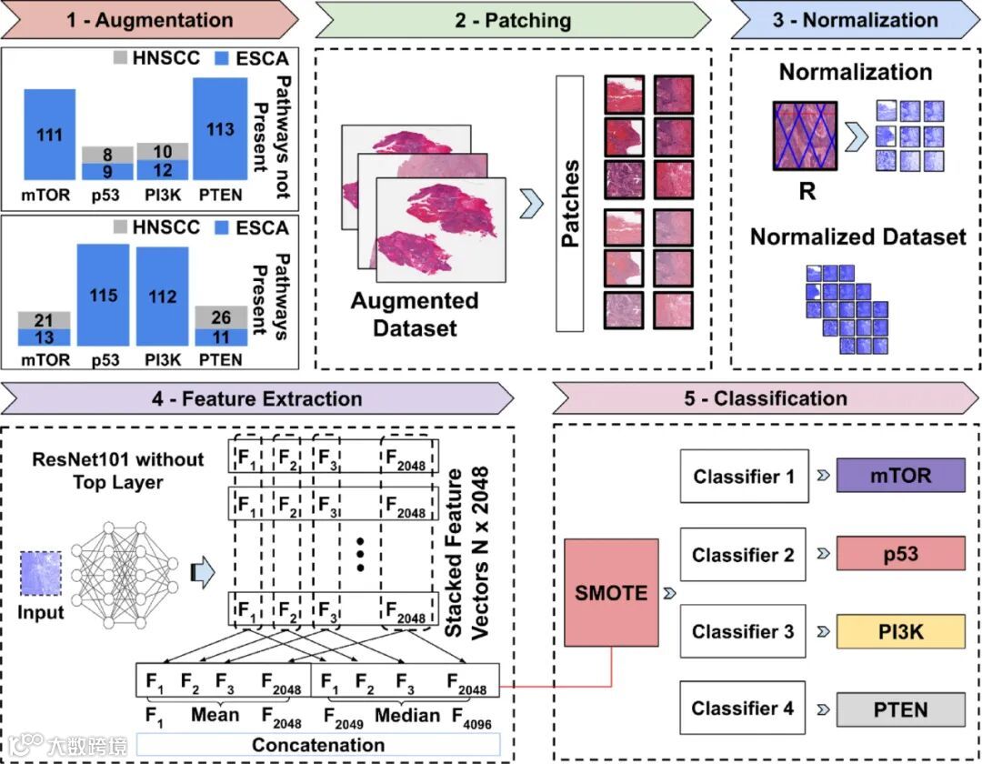 解决这些类别不平衡问题对提高我们模型的可靠性和预测性能至关重要。我们通过整合来自TCGA-HNSCC队列的额外数据来应对类别不平衡问题。此策略旨在平衡数据集中少数类的表示。具体而言,我们从HNSCC队列中选择了21名mTOR通路激活的患者,8名p53通路激活的患者,10名PI3K/AKT通路激活的患者,以及26名PTEN通路激活的患者。这些患者被选中,以匹配少数类实例,并被纳入研究中,从而帮助平衡信号通路数据。HNSCC队列中的病例在预处理时与TCGA-ESCA队列中的病例相同。每个WSI图像被划分成多个小块,含有不到10%组织的块被丢弃,以确保图像质量。然后,这些小块通过预训练的ResNet101模型(去掉顶层)进行特征提取。提取的特征被保存,供后续分析使用。最终的数据集按80:20的比例随机划分为训练集和测试集。