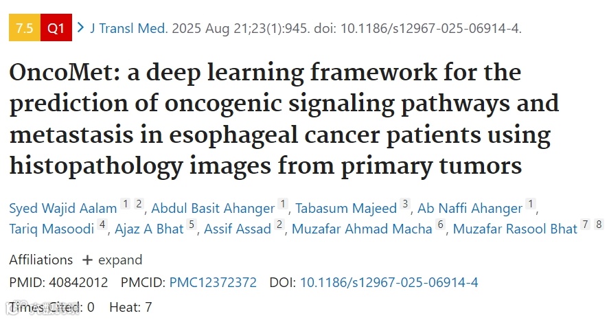 今天小编要和大家分享的这篇文章是2025年7月发表在《Journal of Translational Medicine》(IF:7.5)期刊上的文章《OncoMet: a deep learning framework for the prediction of oncogenic signaling pathways and metastasis in esophageal cancer patients using histopathology images from primary tumors》。这篇文章有什么亮点呢,一起跟着小编来看一下叭~