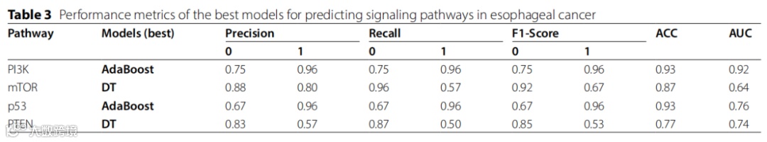 决策树分类器在预测mTOR信号通路时表现最佳。其准确率为87%,AUC(ROC曲线下面积)为64%。当通路缺失时,模型表现出高精度(0.88)、高召回率(0.96)和高F1分数(0.92)。即使在通路存在时,模型保持了较高的精度(0.80),尽管召回率(0.57)和F1分数(0.67)较低。灵敏度为0.57,特异性为0.95。对于p53信号通路,AdaBoost模型的表现优于其他分类器。其精确率、召回率和F1分数分别为0.67(通路缺失时)和0.96(通路存在时)。该模型表现出较高的灵敏度(0.95),但特异性较低(0.66)。总的来说,它达到了93%的准确率和76%的AUC。AdaBoost同样在预测PI3K/AKT信号通路时表现出色。它的精度、召回率和F1分数分别为0.75(通路缺失时)和0.96(通路存在时)。该模型表现出较高的灵敏度(0.95)和特异性(0.75),准确率为93%,AUC为92%。对于PTEN信号通路,决策树分类器提供了最佳结果。它在通路缺失时的精度、召回率和F1分数分别为0.83、0.87和0.85。在通路存在时,精度为0.57,召回率为0.50,F1分数为0.53。灵敏度为0.50,特异性为0.86,准确率为77%,AUC为74%。最佳模型在食管癌信号通路预测中的性能指标总结在表3中。这些模型是根据其出色的准确率、精度、召回率和F1分数选择的,展示了它们在识别与食管癌相关的关键信号通路方面的有效性。