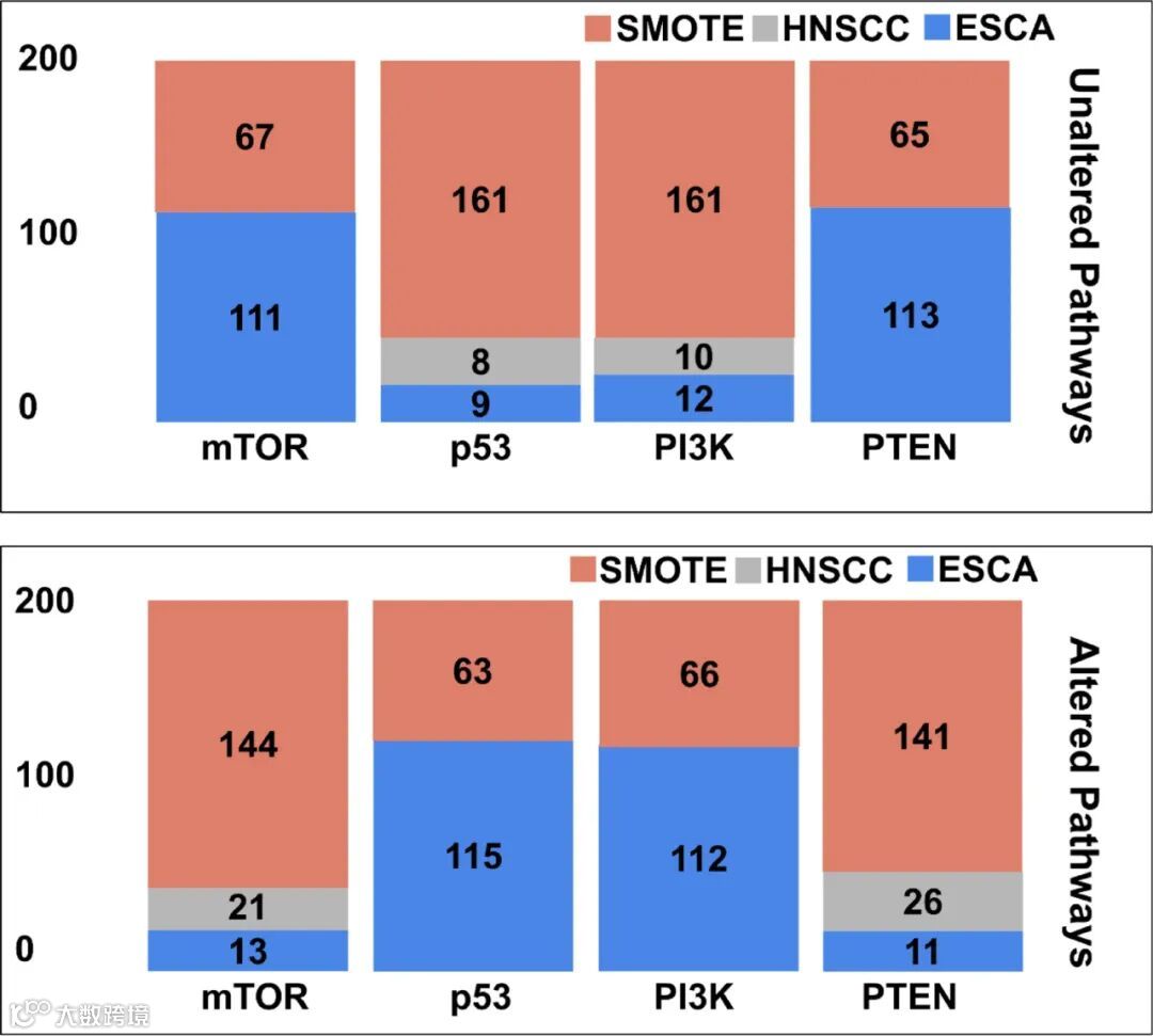 我们模型预测这些通路激活的能力进一步强调了其在临床环境中的潜在应用价值。识别mTOR、PTEN、p53和PI3K/AKT通路的状态可以为个体患者的食管癌分子基础提供有价值的见解,从而指导个性化治疗策略。在数据中遇到的显著不平衡问题,其中大多数实例显示这些通路缺失,凸显了数据增强和平衡技术的必要性。通过纳入来自TCGA-HNSCC队列的额外数据,有助于缓解这些不平衡问题。然而,部分不平衡问题仍然存在,强调了实现完全平衡数据集的持续挑战。