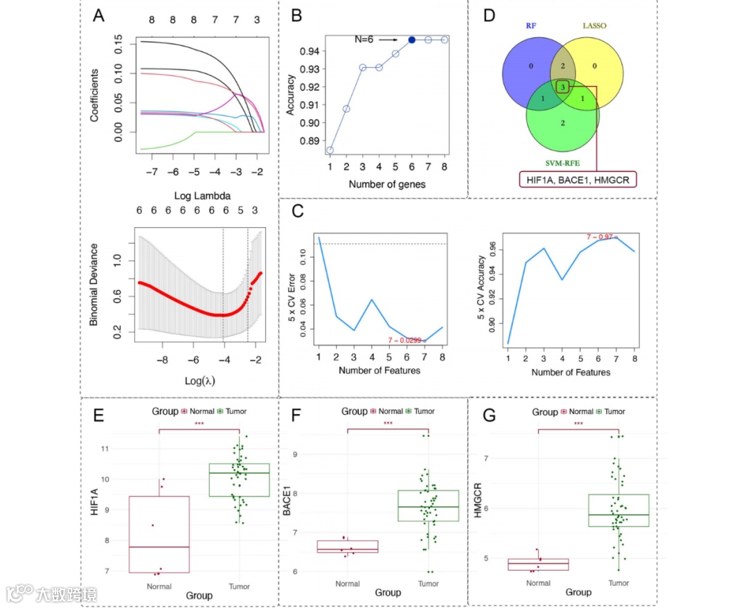 LASSO逻辑回归算法的系数和正则化图(图4A)、随机森林算法的准确率曲线(筛选出6个相关特征,图4B)及SVM-RFE算法的五折交叉验证准确率和误差率曲线(最大准确率=0.97,最小RMSE=0.0299,图4C)共同筛选核心基因。3种机器学习算法交集靶点的Venn图获得HMGCR、BACE1和HIF1A(图4D);这3个靶点在GSE16088和GSE16091数据集中的表达箱线图显示均在骨肉瘤组织中高表达(图4E-G)。