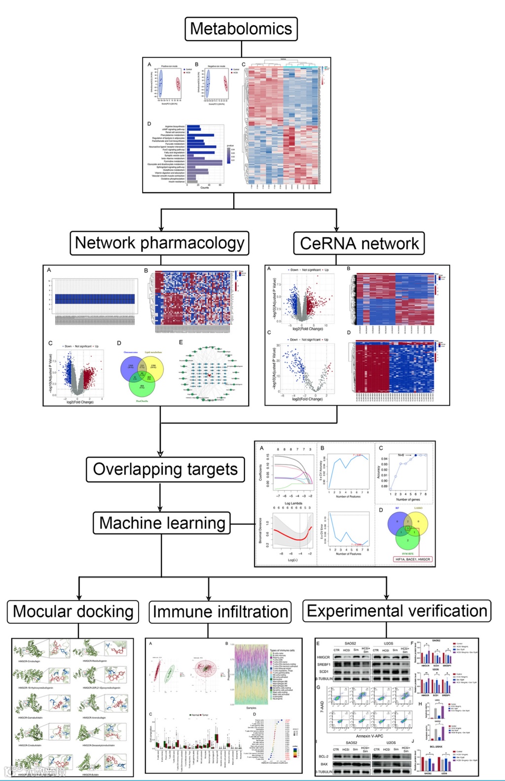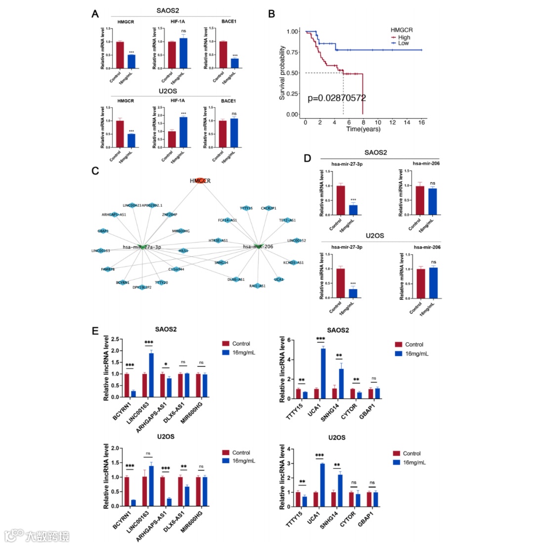 l核心靶点鉴定:筛选出HMGCR作为HCSI抗骨肉瘤的关键靶点,其通过BCYRN1-miR-27a-3p-HMGCR轴调控脂质代谢。