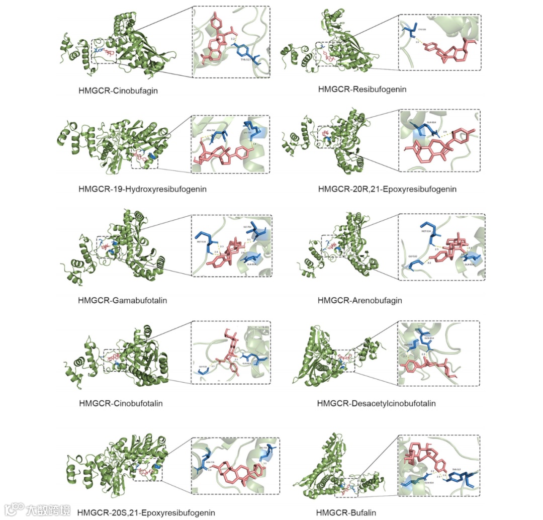 HCSI处理后SAOS2和U2OS细胞中HMGCR、HIF-1A和BACE1的qRT-PCR分析结果显示仅HMGCR表达显著下调(图5A);基于TARGETOS数据集的HMGCRmRNA表达的Kaplan-Meier总生存曲线显示高表达患者生存率更低(p=0.0287,图5B)。lncRNAs-miRNAs-HMGCR网络(图5C)、HCSI处理后SAOS2和U2OS细胞中miR-27a-3p和miR-206的qRT-PCR分析(图5D)及10个lncRNA的表达变化(BCYRN1表达显著降低,图5E)共同确定BCYRN1-miR-27a-3p-HMGCR轴。10种化合物与HMGCR的分子对接结果可视化中,绿色部分代表HMGCR蛋白,红色部分代表化合物,黄色虚线为氢键相互作用,蓝色部分为参与氢键的氨基酸残基,结合能均低于-7kJ・mol⁻¹(图7)。