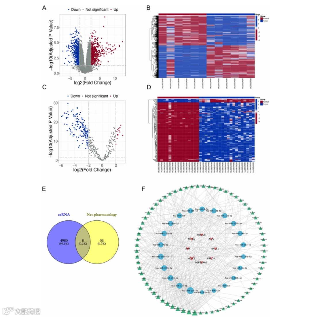 分析GEO数据集获得差异lncRNA和miRNA,GSE225588数据集中差异lncRNA的火山图显示519个上调、474个下调(图3A);993个差异lncRNA的热图(图3B)展示其表达模式。GSE65071数据集中差异miRNA的火山图显示13个上调、136个下调(图3C);149个差异miRNA的热图(图3D)呈现其表达特征。ceRNA与网络药理学交集mRNA的Venn图获得8个基因(图3E);“lncRNAs-miRNAs-mRNAs”ceRNA网络图中,三角形节点代表lncRNAs,圆形节点代表miRNAs,V形节点代表mRNAs,节点大小与RNA的度值相关(图3F)。