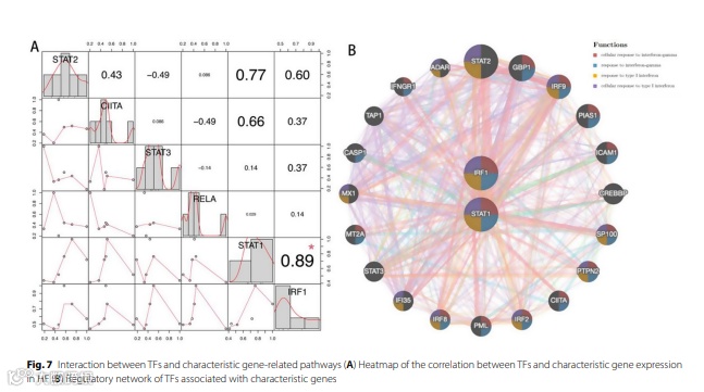 该图展示了转录因子(TFs)与特征基因的相互作用。热图显示了4个关键TFs(CIITA、STAT3、RELA、STAT2)与特征基因表达的相关性,其中STAT2与IRF1、STAT1相关性显著;调控网络展示了这些TFs与特征基因相关的通路,主要富集于对干扰素-γ的细胞应答等功能。