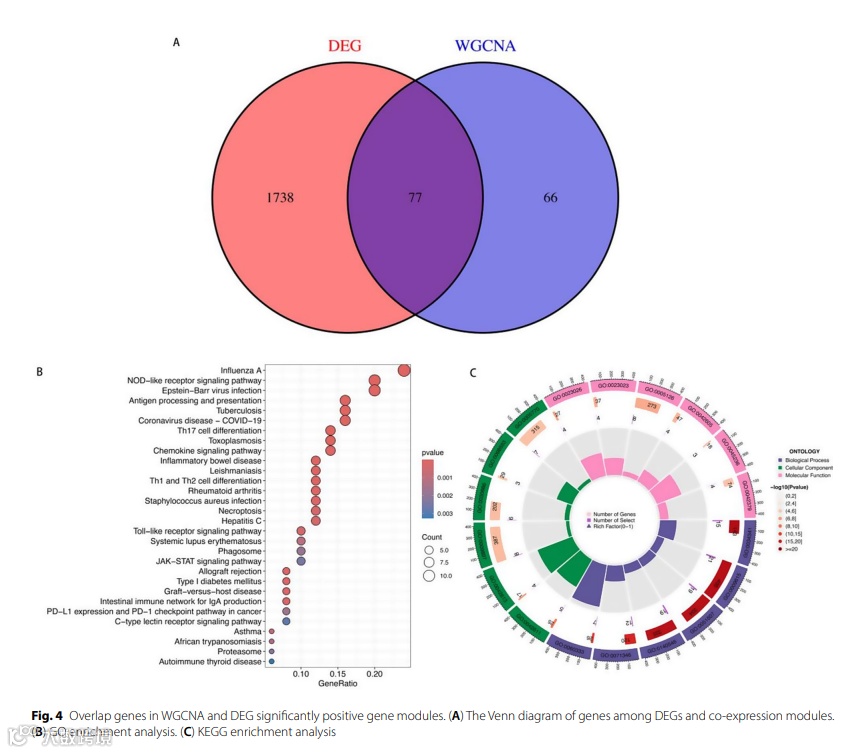 呈现了WGCNA和DEGs显著正相关基因模块的重叠情况及功能富集分析结果。韦恩图显示WGCNA的MElightyellow模块与DEGs有77个重叠基因;GO富集分析表明这些基因与质膜外侧、溶酶体膜等生物膜结构相关;KEGG富集分析显示它们主要参与甲型流感、Epstein-Barr病毒感染以及NOD样受体信号通路、趋化因子信号通路等。