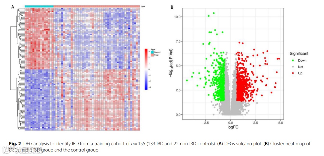呈现了从包含133名IBD患者和22名非IBD对照的训练队列中识别出的IBD相关差异表达基因(DEGs)结果。火山图(A)显示了基因的表达差异情况,其中显著上调和下调的基因被分别标记;聚类热图(B)则直观展示了IBD组和对照组中这些DEGs的表达模式差异,共筛选出1816个符合条件。