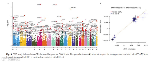 该图展示了基于eQTL数据和大规模GWAS数据的SMR分析结果。曼哈顿图显示了与IBD相关的基因;散点图表明IRF1与IBD风险呈显著正相关,证实了IRF1与IBD风险的因果关联。