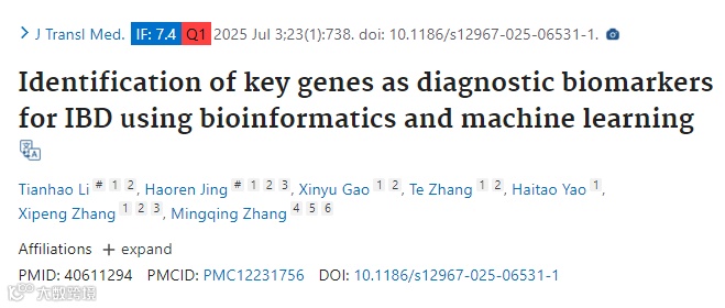 近年来,高通量测序技术在全基因组关联研究(GWAS)中被用于识别IBD的易感区域,但由于疾病机制的复杂性,这些风险位点难以有效转化为临床治疗手段。同时,表达数量性状位点(eQTL)分析和孟德尔随机化等方法的发展,为整合多维度数据、探究基因与疾病的因果关系提供了可能。鉴于此,本研究通过整合生物信息学、机器学习和孟德尔随机化等方法,对IBD相关基因进行系统分析,旨在识别潜在的诊断生物标志物,探究其与免疫细胞浸润的关联及与IBD的因果关系,为理解IBD发病机制和开发治疗策略提供依据。