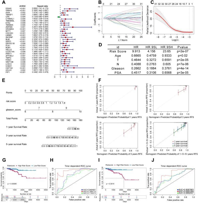 我们利用TCGA数据库进行单变量Cox回归分析,以筛选与前列腺癌患者无复发生存期(RFS)相关的ARRDEGs。在304个ARRDEGs中,32个基因与前列腺癌预后显著相关。随后应用LASSO算法进一步筛选这些基因,最终确定3个核心ARRDEGs:LMNB1、SSPO和PLK1。基于其表达水平构建风险评分模型,公式如下:风险评分 = (0.02181362 × LMNB1 表达量) + (0.17958708 × SSPO 表达量) + (0.25686309 × PLK1 表达量)。