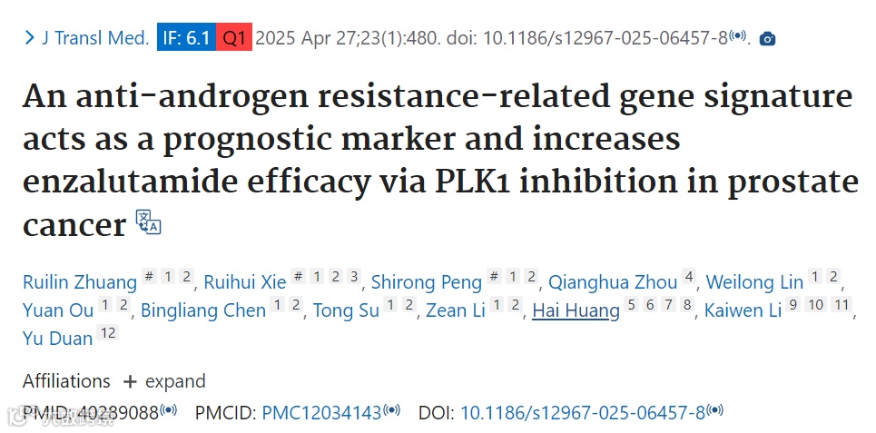 题目:抗雄激素抵抗相关基因特征可作为预后标志物,并通过抑制PLK1增强前列腺癌中恩杂鲁胺的疗效
