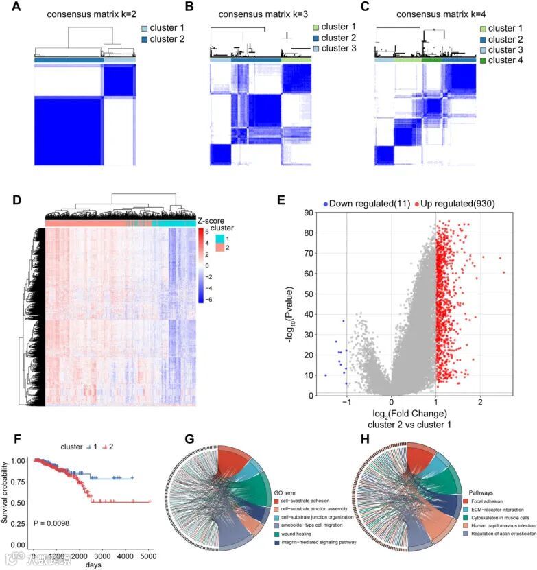 图2.ARRDEGs的聚类分析揭示两种具有不同基线特征和生存结局的前列腺癌亚型。