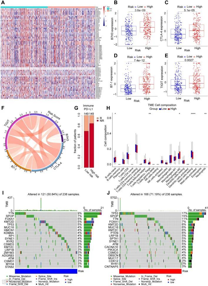 图4.高危与低危前列腺癌患者的免疫微环境景观与肿瘤突变负荷(TMB)分析。